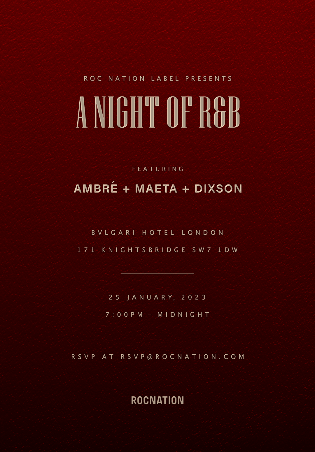 The Inaugural Roc Nation Event: A Night of R&B at the Bvlgari Hotel London, featuring performances by Ambré, Maeta, and Dixon.